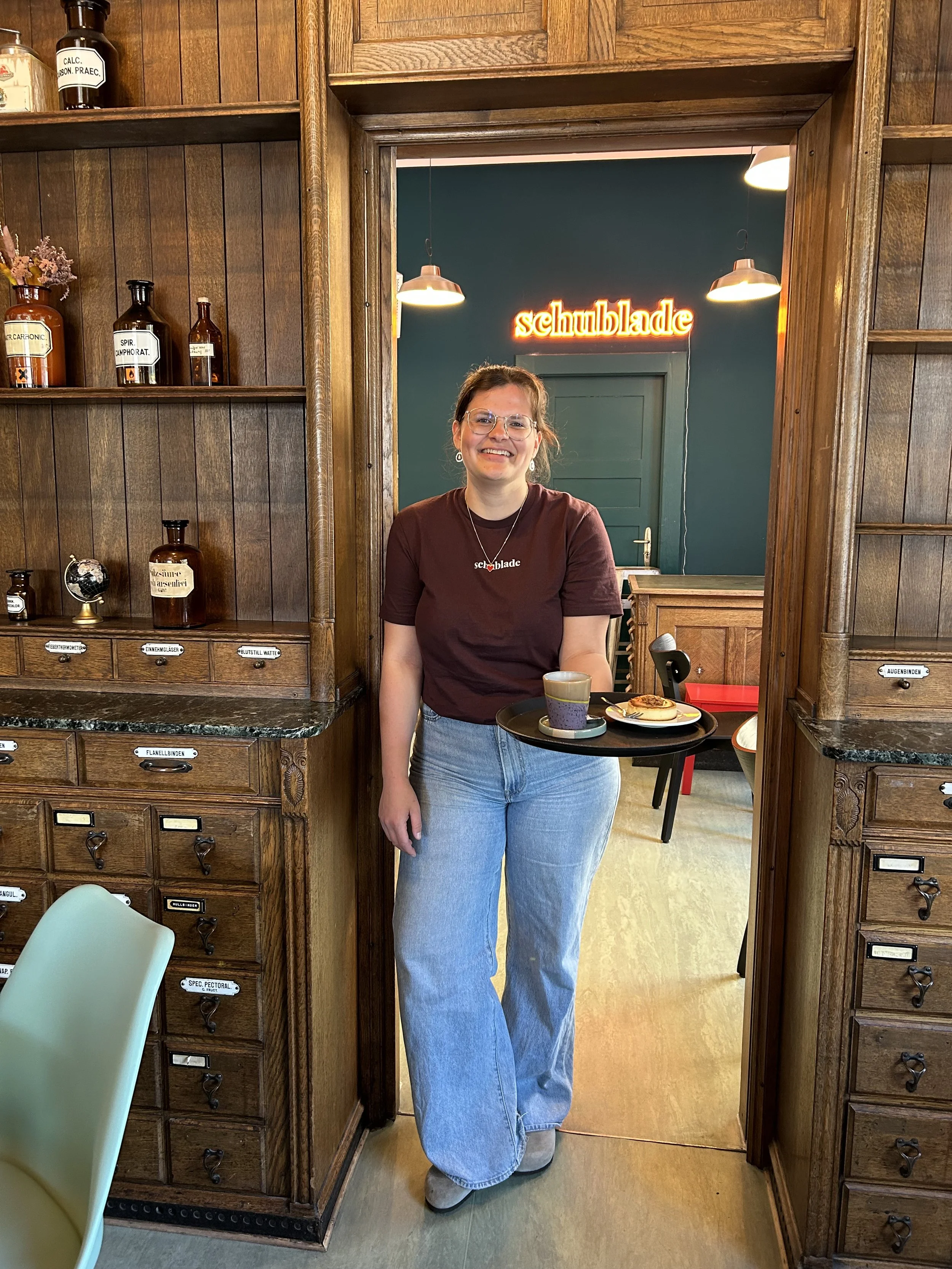 Was macht das Café Schublade besonders? „Das Café Schublade soll ein bestimmtes Gefühl auslösen – stell dir vor, du fährst nach Italien, noch auf dem Weg dorthin, trinkst du deinen ersten „Vacanza Espresso“ an einer italienischen Tankstelle, an der du Rast machst. Es ist der beste Espresso überhaupt. Wir haben eine eigene Röstmischung, die Kuchen sind selbstgemacht. Und es gibt kleine Snacks wie Brote mit Feta und Olivenpaste. Das Limettenwasser steht (noch) nicht auf der Karte, aber inzwischen trinken es viele Gäste, was vermutlich daran liegt, dass es zu meinem Lieblingsgetränk wurde, nachdem ich das Café eröffnet habe.“ (lacht)
