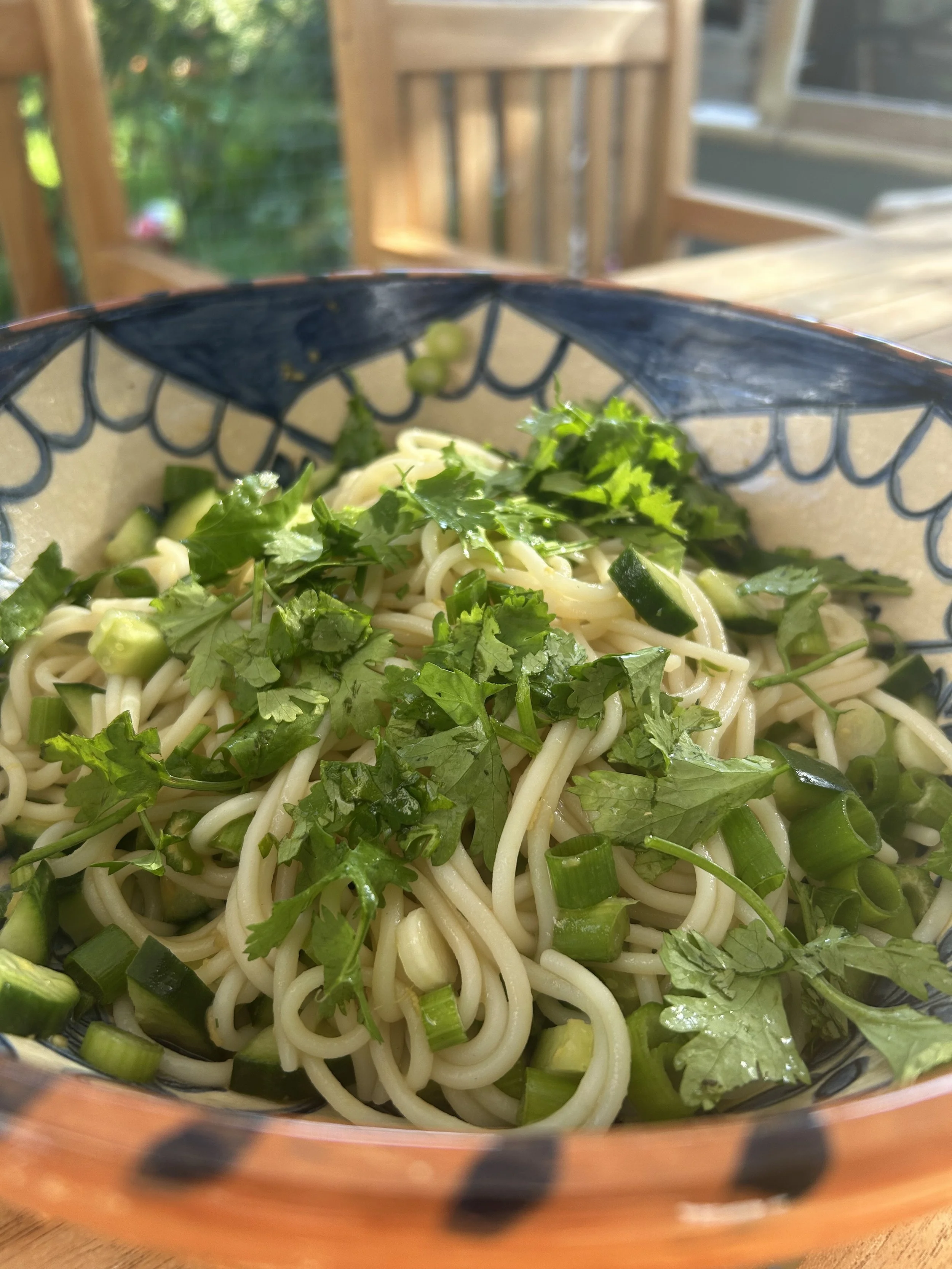 Lauwarmer Reisnudelsalat mit Gemüse vom Biohof Miller